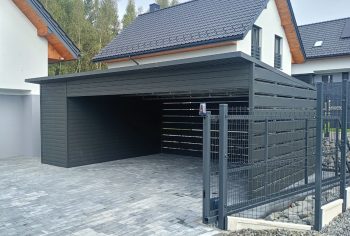 Nowoczesny carport o wymiarach 7m x 5m ze schowkiem narzędziowym do którego drzwi wejściowe ukryte zostały z tyłu konstrukcji. Wykonany w eleganckiej kolorystyce która świetnie wpasuje się w każde otoczenie. Idealne rozwiązanie dla osób prywatnych, firm oraz inwestorów poszukujących funkcjonalnego zadaszenia na samochód. Konstrukcja wykonana jest z wysokiej jakości profili OCYNKOWANYCH co gwarantuje trwałość, stabilność i odporność na warunki atmosferyczne. Carport produkowany jest na indywidualne zamówienie, dzięki czemu możemy dopasować jego wymiary, kolorystykę oraz detale do potrzeb klienta i miejsca montażu. Specyfikacja techniczna: Szerokość: 7,0m Głębokość: 5,0m Wysokość przodu: 2,40m. Wysokość tyłu: 2,1m. Konstrukcja: całość wykonana z profili zamkniętych ocynkowanych 40×60, grubość ścianki 1,5mm. Drzwi wejściowe do schowka: 1 szt. kolor antracytowy w wersji matowej (BTX 7016) panel T7. Ściany: kolor antracytowy w wersji matowej (BTX 7016) panel poziomy T7. Dach: spad w tył pokryty blachą antracytową w wersji matowej (BTX 7016) panel dachowy T12. Montaż, komplet obróbek blacharskich oraz kotwienie do podłoża – GRATIS! Cena transportu wyliczana indywidualnie w zależności od miejsca montażu. Opcje dodatkowe za dopłatą: – Orynnowanie SET – Filc antykondensacyjny pod dach – okno uchylne PCV 80×60 – drzwi wejściowe 0,9m x 2,0m
