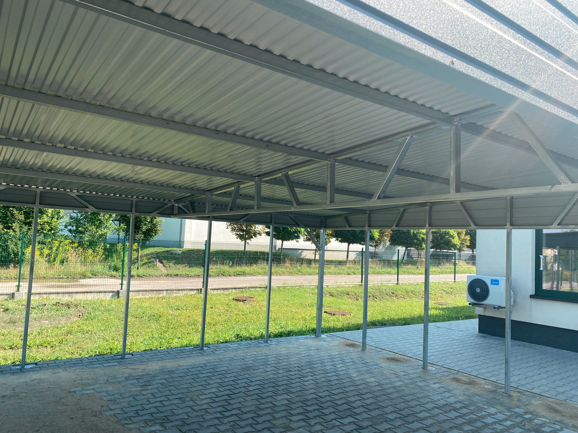 Zadaszenie o wymiarach 6m x 6m, wykonany w eleganckiej, grafitowej kolorystyce. Idealne rozwiązanie dla osób prywatnych, firm oraz inwestorów poszukujących funkcjonalnego zadaszenia na samochód. Konstrukcja wykonana jest z wysokiej jakości profili OCYNKOWANYCH co gwarantuje trwałość, stabilność i odporność na warunki atmosferyczne. Specyfikacja techniczna: Szerokość: 6,0m Głębokość: 6,0m Wysokość przodu: 2,40m. Wysokość tyłu: 2,10m. Blacha maskująca konstrukcję dachową: kolor antracytowy w wersji matowej (BTX 7016) panel poziomy T7. Dach: spad w tył pokryty blachą antracytową w wersji matowej (BTX 7016) panel dachowy T12. Konstrukcja: Całość konstrukcji wykonana jest z profili zamkniętych ocynkowanych 40×60, grubość ścianki 1,5mm Montaż, komplet obróbek blacharskich oraz kotwienie do podłoża – GRATIS! Cena transportu wyliczana indywidualnie w zależności od miejsca montażu. Opcje dodatkowe: – Orynnowanie SET – Filc antykondensacyjny pod dach Wiata produkowana jest na indywidualne zamówienie, dzięki czemu możemy dopasować jej wymiary, kolorystykę oraz detale do potrzeb klienta i miejsca montażu.