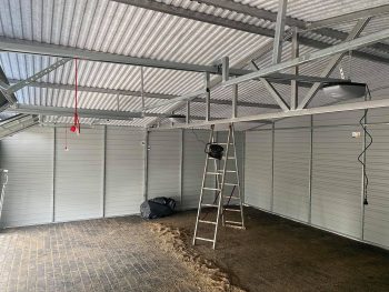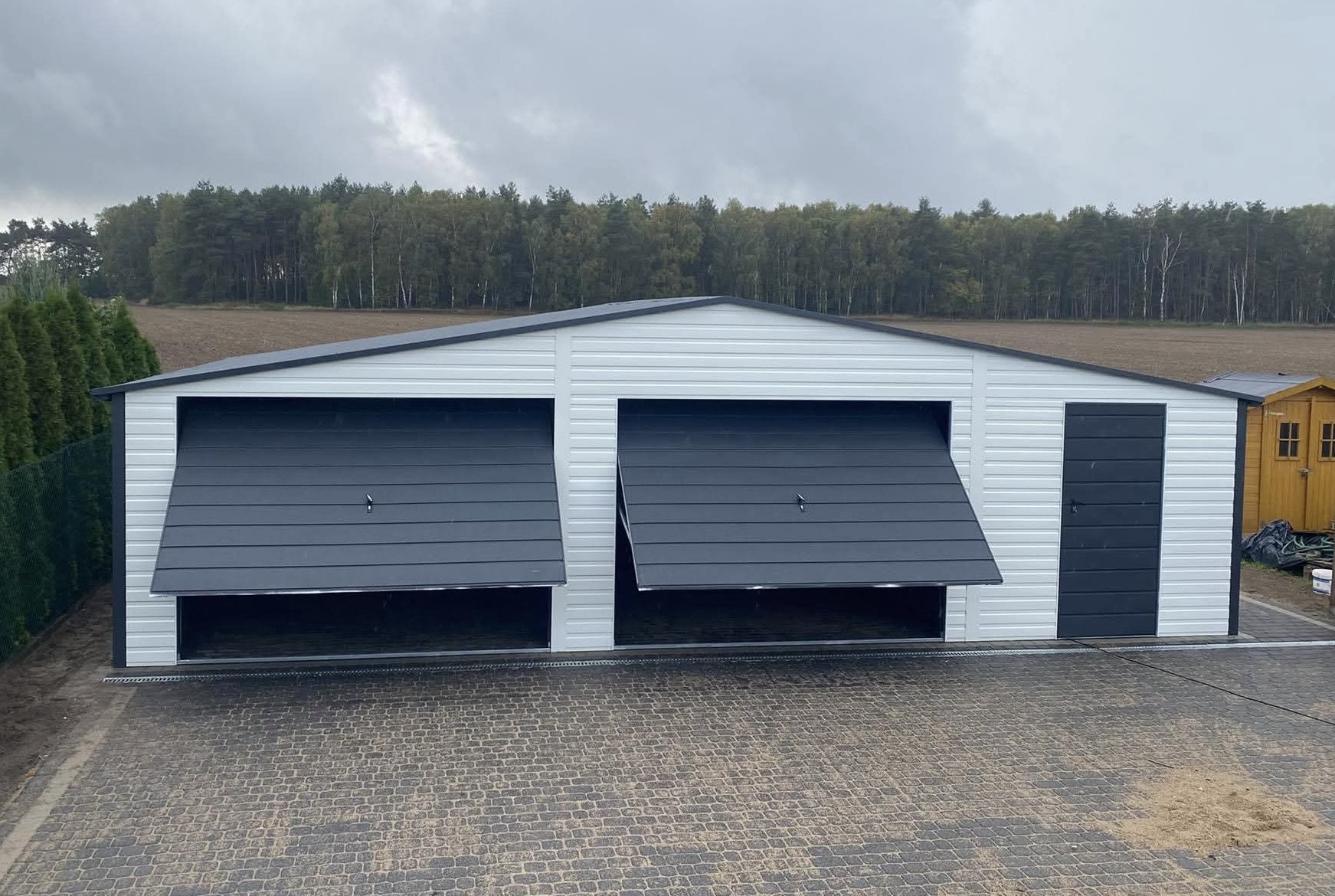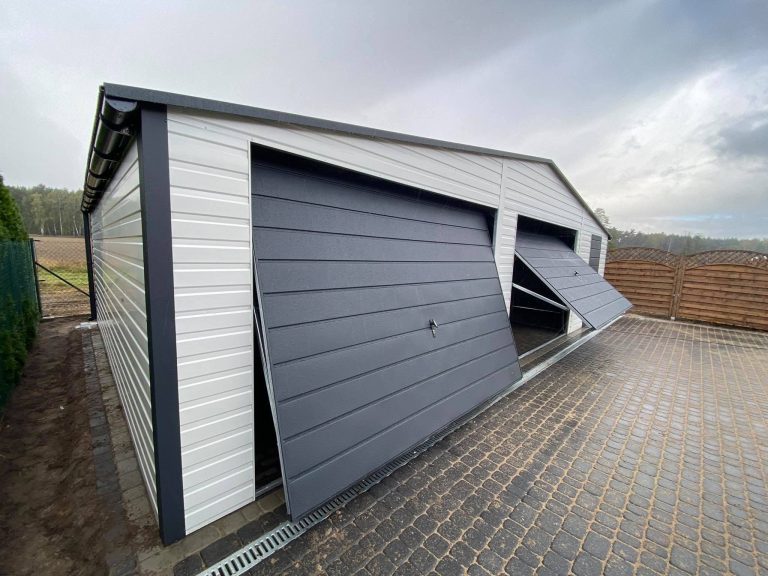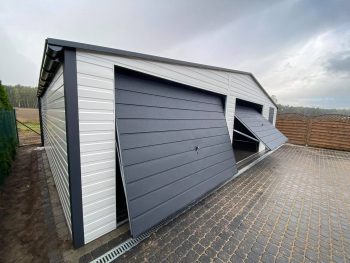 Funkcjonalny garaż blaszany dwustanowiskowy o solidnej konstrukcji z profili zamkniętych ocynkowanych która gwarantuje trwałość i odporność na warunki atmosferyczne. Połączenie białego koloru z ciemnym grafitem sprawiają, że garaż doskonale komponuje się z nowoczesną zabudową. Garaż produkowany jest na indywidualne zamówienie, dzięki czemu możemy dopasować jego wymiary, kolorystykę oraz detale do potrzeb klienta i miejsca montażu. Specyfikacja techniczna: Szerokość: 9,0m Głębokość: 6,0m Wysokość ścian bocznych: 2,13m. Wysokość kalenicy (szczytu): 2,93m. Brama: 2 szt. uchylne, kolor antracytowy w wersji matowej (BTX 7016) panel T17. Drzwi boczne: 1 szt. kolor antracytowy w wersji matowej (BTX 7016) panel T17. Ściany: kolor biały w wersji matowej (BTX 9010) panel T7. Dach: dwuspadowy pokryty blachą antracytową w wersji matowej (BTX 7016) panel dachowy T12. Konstrukcja: Ściany boczne: profile zamknięte ocynkowane 30×30, grubość ścianki 1,5mm. Belki dachowe i kratownica: profile zamknięte ocynkowane 40×60, grubość ścianki 1,5mm. Słupki pod kratownicę: profile zamknięte ocynkowane 30×50, grubość ścianki 1,5mm. Montaż, komplet obróbek blacharskich oraz kotwienie do podłoża – GRATIS! Cena transportu wyliczana indywidualnie w zależności od miejsca montażu. Opcje dodatkowe: – Orynnowanie SET – Filc antykondensacyjny pod dach – okno uchylne PCV 80×60 – drzwi wejściowe 0,9m x 2,0m – automatyka do bramy (automat, 2x pilot)
