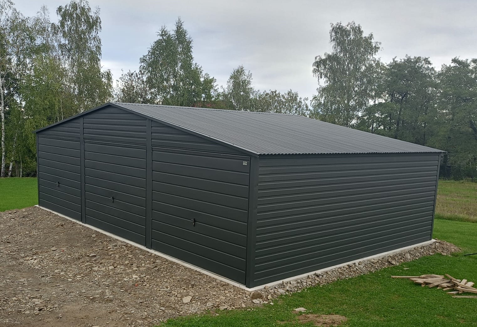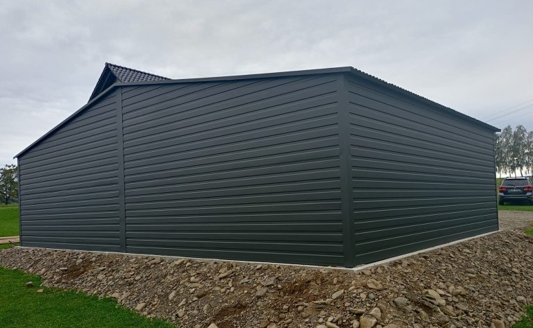Nowoczesny garaż blaszany o wymiarach 9m x 6m z 3 bramami uchylnymi, wykonany w eleganckiej kolorystyce która świetnie wpasuje się w każde otoczenie. Idealne rozwiązanie dla osób prywatnych, firm oraz inwestorów poszukujących funkcjonalnego garażu wielostanowiskowego. Konstrukcja wykonana jest z wysokiej jakości profili OCYNKOWANYCH co gwarantuje trwałość, stabilność i odporność na warunki atmosferyczne. Garaż produkowany jest na indywidualne zamówienie, dzięki czemu możemy dopasować jego wymiary, kolorystykę oraz detale do potrzeb klienta i miejsca montażu. Specyfikacja techniczna: Szerokość: 9,0m Głębokość: 6,0m Wysokość ścian bocznych: 2,13m. Wysokość kalenicy (szczytu): 2,93m. Konstrukcja: Ściany boczne: profile zamknięte ocynkowane 30×30, grubość ścianki 1,5mm. Belki dachowe i kratownica: profile zamknięte ocynkowane 40×60, grubość ścianki 1,5mm. Słupki pod kratownicę: profile zamknięte ocynkowane 30×50, grubość ścianki 1,5mm. Blacha dachowa: kolor antracytowy w wersji matowej (BTX 7016) panel T12 bez filcu antykondensacyjnego. Blacha na ścianach: kolor antracytowy w wersji matowej (BTX 7016) panel poziomy T7. Blacha na bramach: kolor antracytowy w wersji matowej (BTX 7016) panel poziomy T17. Montaż, komplet obróbek blacharskich oraz kotwienie do podłoża – GRATIS! Cena transportu wyliczana indywidualnie w zależności od miejsca montażu. Opcje dodatkowe: – Orynnowanie SET – Filc antykondensacyjny pod dach: – okno uchylne PCV 80×60 – drzwi wejściowe 0,9m x 2,0m – automatyka do bramy (automat, 2x pilot)