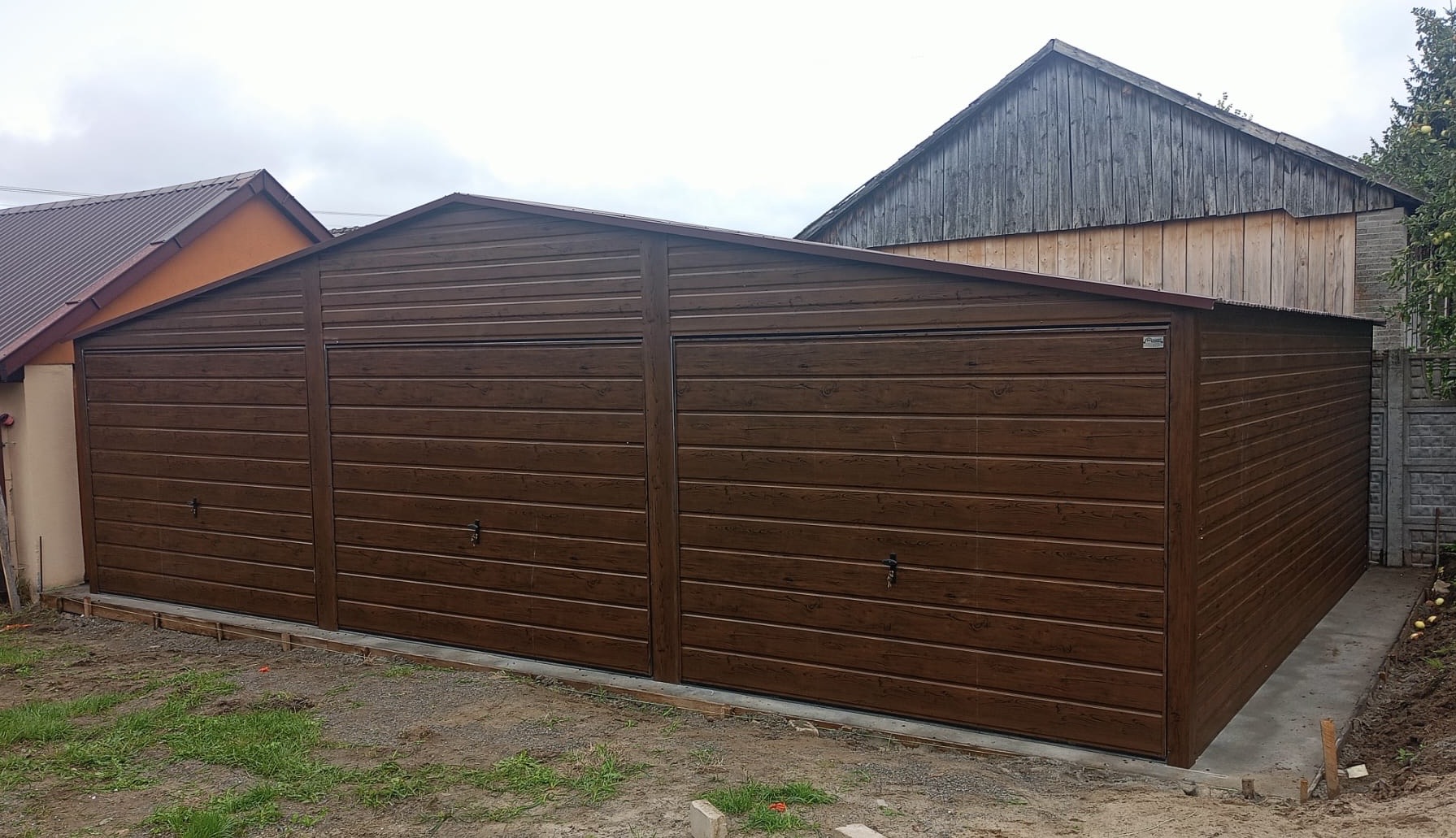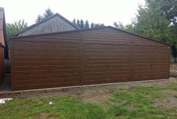 Nowoczesny garaż blaszany o wymiarach 9m x 6m z 3 bramami uchylnymi, wykonany w eleganckiej, drewnopodobnej kolorystyce która świetnie wpasuje się w każde otoczenie. Konstrukcja wykonana jest z wysokiej jakości profili OCYNKOWANYCH co gwarantuje trwałość, stabilność i odporność na warunki atmosferyczne. Garaż produkowany jest na indywidualne zamówienie, dzięki czemu możemy dopasować jego wymiary, kolorystykę oraz detale do potrzeb klienta i miejsca montażu. Specyfikacja techniczna: Szerokość: 9,0m Głębokość: 6,0m Wysokość ścian bocznych: 2,13m. Wysokość kalenicy (szczytu): 2,93m. Konstrukcja: Ściany boczne: profile zamknięte ocynkowane 30×30, grubość ścianki 1,5mm. Belki dachowe i kratownica: profile zamknięte ocynkowane 40×60, grubość ścianki 1,5mm. Słupki pod kratownicę: profile zamknięte ocynkowane 30×50, grubość ścianki 1,5mm. Blacha dachowa: kolor brązowy w wersji matowej (BTX 8017) panel T12 bez filcu antykondensacyjnego. Blacha na ścianach: kolor ciemny orzech w wersji matowej, panel poziomy T8. Blacha na bramach: kolor ciemny orzech w wersji matowej, panel poziomy T17. Montaż, komplet obróbek blacharskich oraz kotwienie do podłoża – GRATIS! Cena transportu wyliczana indywidualnie w zależności od miejsca montażu. Opcje dodatkowe: – Orynnowanie SET – Filc antykondensacyjny pod dach: – okno uchylne PCV 80×60 – drzwi wejściowe 0,9m x 2,0m – automatyka do bramy (mechanizm, 2x pilot)