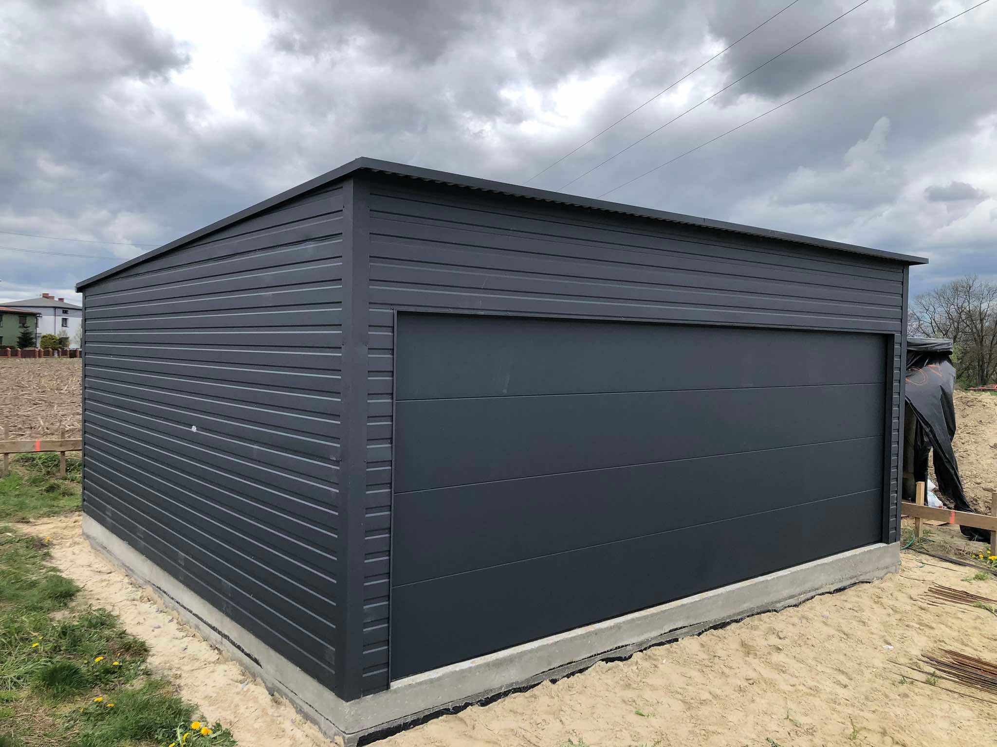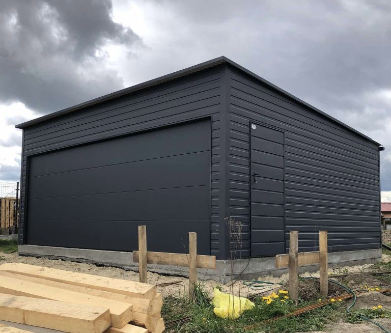 Konstrukcja: Ściany boczne: profile zamknięte ocynkowane 30×30, grubość ścianki 1,5mm. Belki dachowe: profile zamknięte ocynkowane 40×60, grubość ścianki 1,5mm. Brama garażowa: Rodzaj bramy: 1 szt. segmentowa w kolorze antracytowym w wersji matowej z napędem. Wymiar otworu: 5,5m. x 2,10m Wyposażenie: napęd z kompletem pilotów. Montaż, komplet obróbek blacharskich oraz kotwienie do podłoża – GRATIS! Cena transportu wyliczana indywidualnie w zależności od miejsca montażu. Opcje dodatkowe: – Orynnowanie SET – Filc antykondensacyjny pod dach – okno uchylne PCV 80×60 – drzwi wejściowe 0,9m x 2,0m