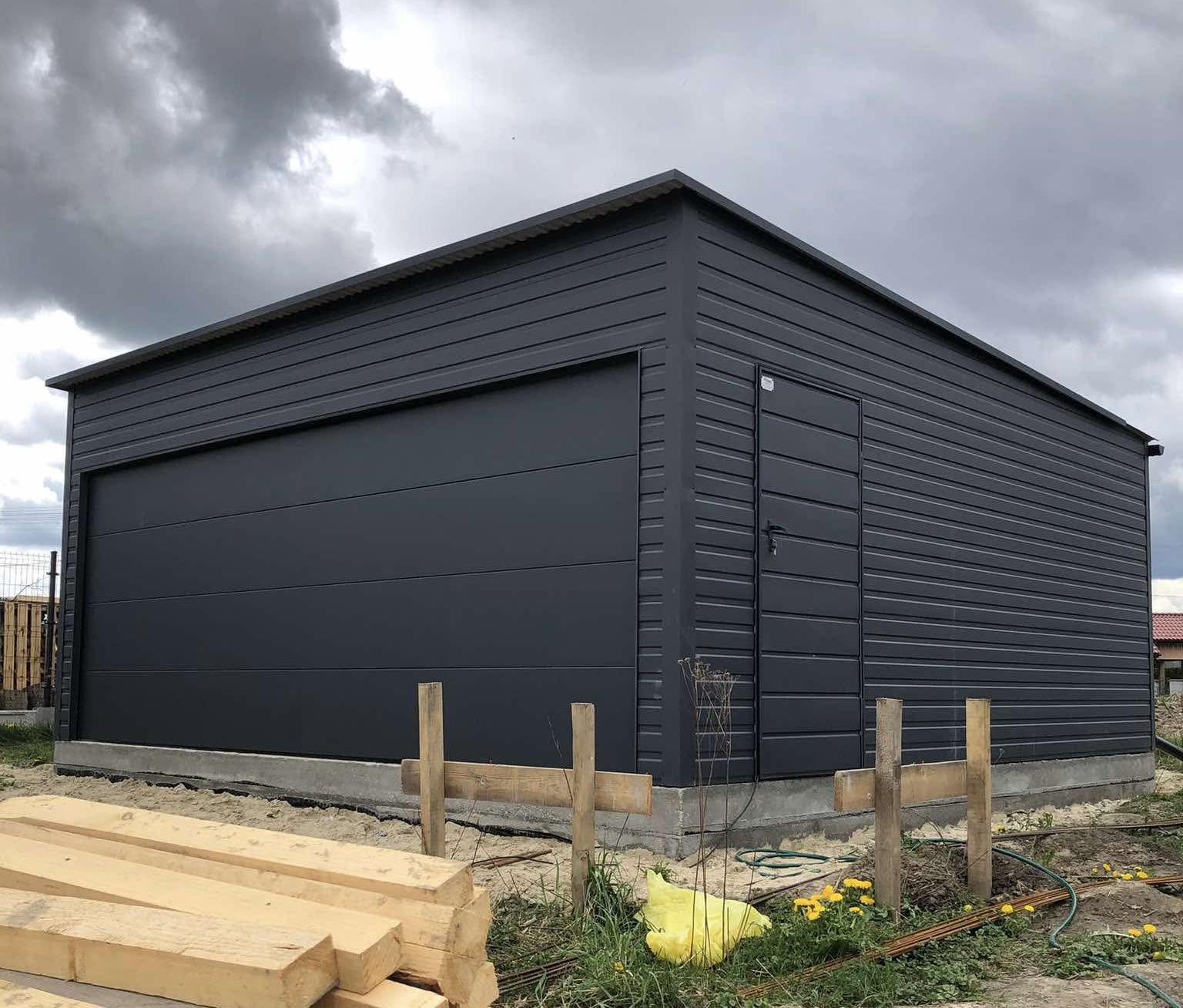 Szerokość: 6,0m Głębokość: 6,0m Wysokość przodu: 2,50m. Wysokość tyłu: 2,20m. Drzwi boczne: 1 szt. kolor antracytowy w wersji matowej (BTX 7016) panel T17. Ściany: kolor antracytowy w wersji matowej (BTX 7016) panel T7. Dach: spad w tył pokryty blachą antracytową w wersji matowej (BTX 7016) panel dachowy T12.